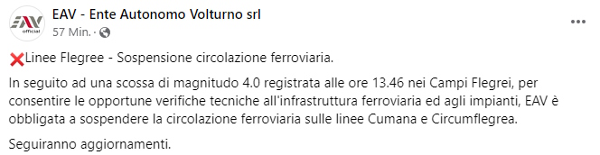 Entre-temps, le trafic ferroviaire sur les lignes Phlégréennes a été temporairement suspendu pour des contrôles sur les systèmes. Dans la zone touchée par le tremblement de terre, une crête de plage à Bacoli s'est effondrée.