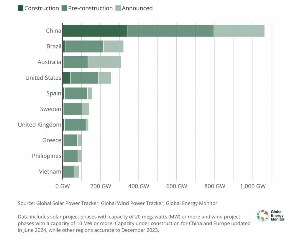 Selon l'étude, environ 339 gigawatts (GW) de capacité renouvelable sont actuellement en construction en Chine : 159 GW d'énergie éolienne et 180 GW d'énergie solaire. Ce chiffre est presque le double de celui du reste du monde réuni, plaçant la Chine en première place, suivie du Brésil avec seulement 13 GW en construction et des États-Unis, qui occupent la troisième place avec 50 GW en construction.