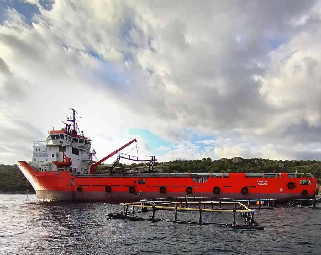 C'est la première fois que La Healthy Seas Foundation s'associe à la Fondation caritative Athanasios C. Laskaridis, connue pour ses projets de restauration côtière à grande échelle et ses activités de conservation marine en Grèce. A bord de notre bateau nous nous positionnons face au Typhoon, le navire opérationnel, pour suivre au plus près les différentes phases de la mission. Les nombreux anneaux de la ferme abandonnée se détachent devant nous : un paysage suspendu entre beauté et décadence, une sorte de « décharge flottante ».