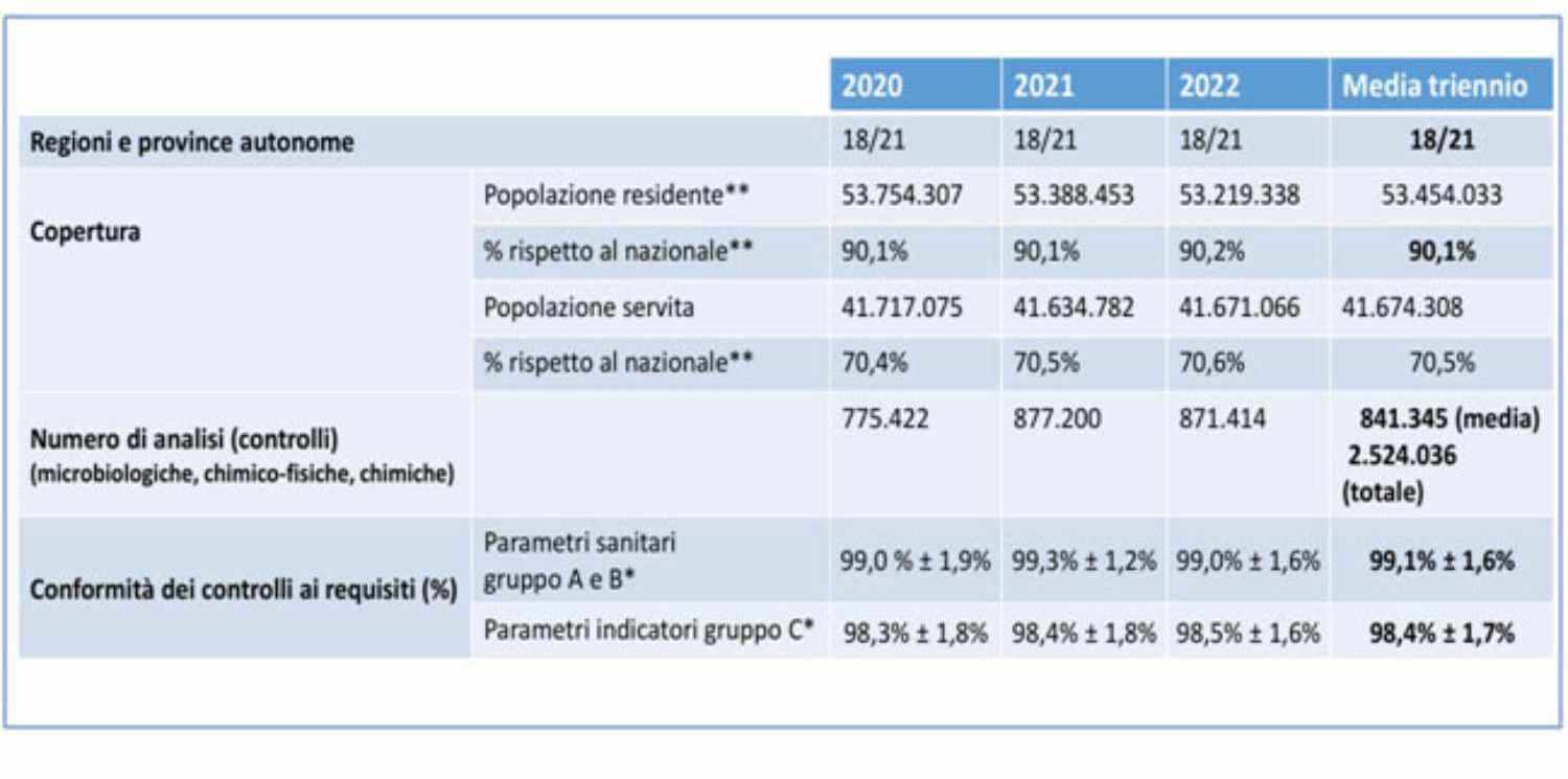 Le rapport du Centre National pour la Sécurité de l'Eau de l'Istituto Superiore di Sanità photographie, en 2024, une réalité différente : l'eau potable distribuée en Italie respecte les paramètres sanitaires dans 99,1% des cas et 98,4% pour les indicateurs, liés à des caractéristiques telles que l'odeur, le goût et la couleur. Des chiffres qui proviennent de plus de 2,5 millions d’analyses réalisées entre 2020 et 2022, sur un échantillon couvrant plus de 90 % de la population.