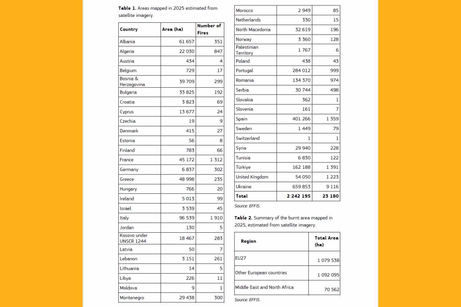 2025 marque également un déplacement géographique du risque. L'Allemagne, la Slovaquie et Chypre ont enregistré des niveaux records de zones brûlées. Le feu se déplace vers des latitudes plus élevées, suite à des conditions climatiques favorables : températures élevées, végétation sèche et périodes prolongées sans pluie. Au total, 7 783 incendies ont été cartographiés dans 25 pays de l'UE. Seuls le Luxembourg et Malte sont restés indemnes.