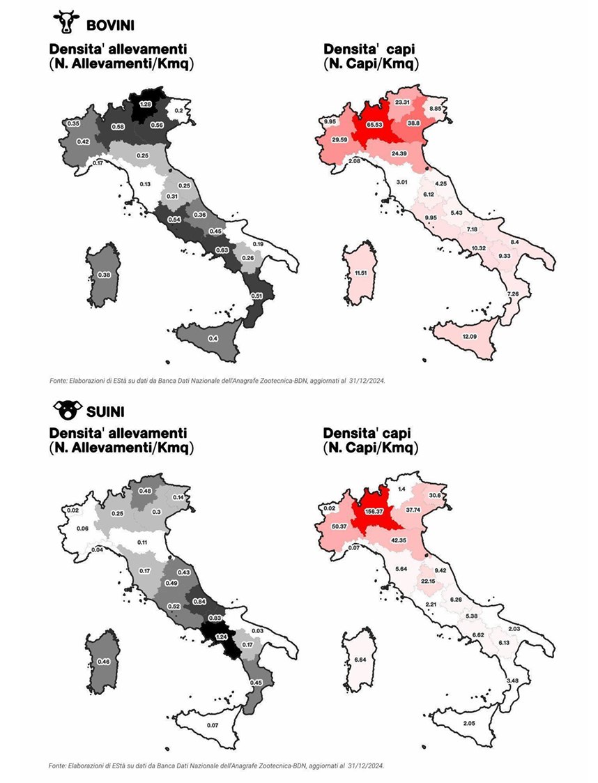 La Lombardie est en tête du classement national de l'agriculture intensive avec plus de 5,2 millions de bovins et de porcs. Des chiffres impressionnants, égaux à environ 1 tête pour 2 habitants de la Lombardie. La région détient 40% du total des animaux nationaux, ce qui monte à 47% en considérant uniquement les porcs, avec trois provinces – Brescia, Mantoue et Crémone – protagonistes du record. Au cours des dix dernières années, la production laitière a augmenté de 11 %, tandis que la taille moyenne des exploitations augmente et que les petites entreprises disparaissent, laissant la place à des méga-exploitations de plus de 500 animaux.