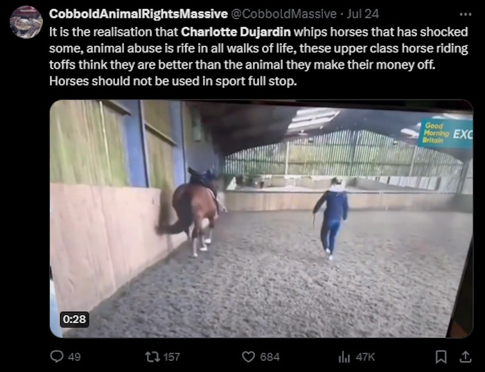 Les images ont inévitablement déclenché une vague d’indignation. Suite au scandale, la cavalière a partagé une publication sur son compte Instagram déclarant ce qui suit :