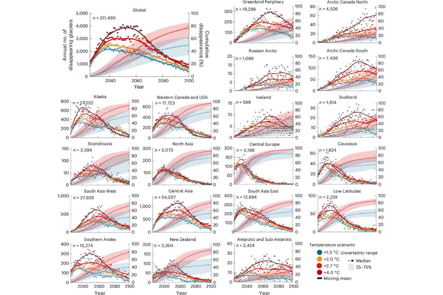 Selon l'analyse de Lander Van Tricht et ses collègues, entre 2041 et 2055, la Terre pourrait voir jusqu'à 4 000 glaciers disparaître chaque année, soit un rythme cinq fois plus élevé qu'aujourd'hui. Les Alpes seront parmi les zones les plus vulnérables : d’ici 2033, plus d’une centaine de glaciers européens sont voués à fondre de manière irréversible. Les petits glaciers et ceux qui fondent plus rapidement, comme ceux de l’ouest des États-Unis et du Canada, disparaîtront plus tôt que les autres.